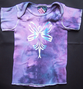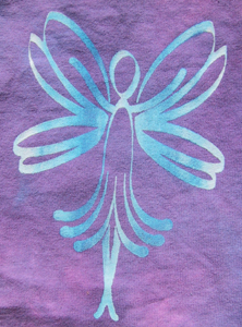 I designed this to be something different from all the stencil fairies I see on other shirts. It looks really cool in a white mixed with color print (blue and white in these pictures).